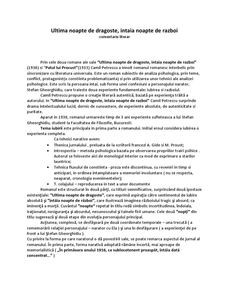 Camil Petrescu Ultima Noapte De Dragoste Intaia Noapte De Razboi Comentariu Bac